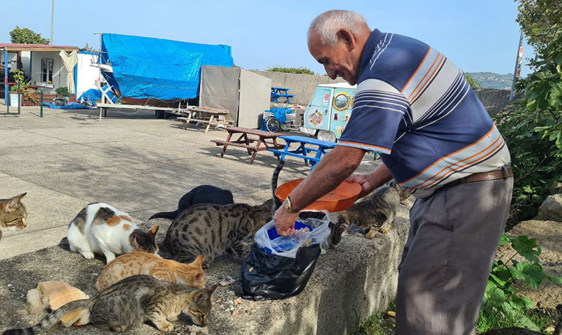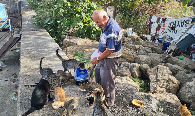 Zonguldak’ın Alaplı ilçesinde yaşayan 72 yaşındaki Hasan Kırmacıoğlu, her gün yürüyerek beş kilometre uzaktaki balıkçı barınağına giderek 100 kediyi kendi imkanları ile besliyor.