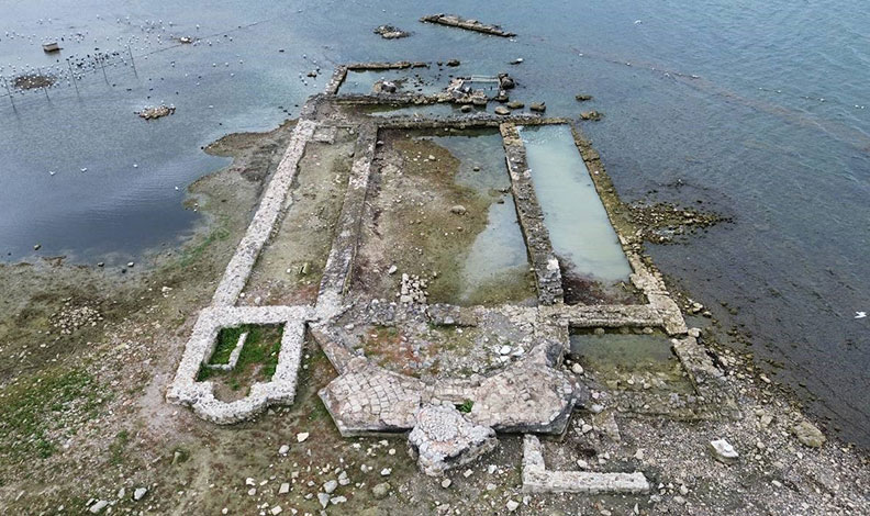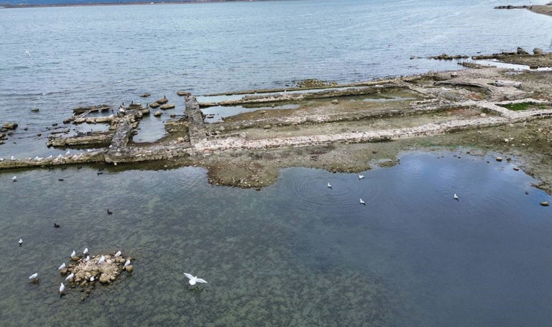 İznik Gölü’nde yaşanan su çekilmesi nedeniyle, 2014’te keşfedilen batık bazilika kalıntısının artık tamamen görünür hale geldi.