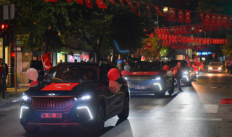 Türkiye Cumhuriyeti’nin kuruluşunun 101’inci yıl dönümü, Yıldırım’da büyük bir coşkuyla kutlandı. Kurtuluş Caddesi esnaf ziyareti ve bayrak dağıtımı ile başlayan kutlamalar çerçevesinde Karaağaç Mahallesi’nden Ahmet Taner Kışlalı Meydanı’na kadar klasik, modifiye ve yerli otomobilimiz TOGG araçları ve motor konvoyu düzenlenirken, Türk bayraklarıyla mehter ve kılıç kalkan eşliğinde yapılan yürüyüş, bayram coşkusunu ikiye katladı.