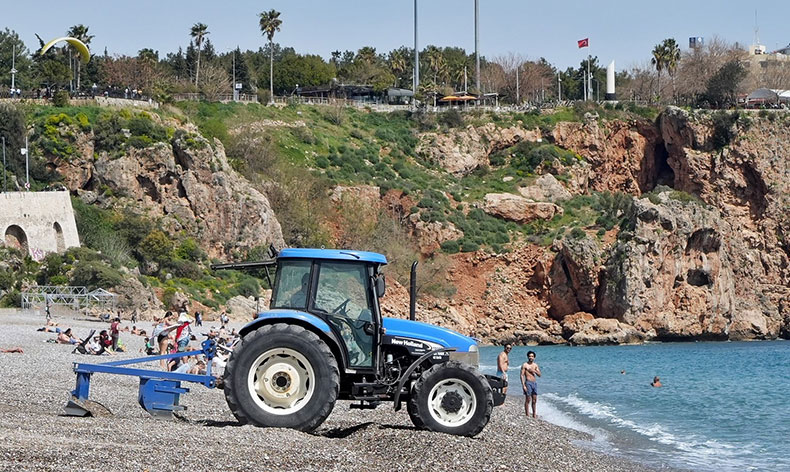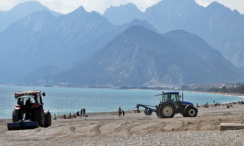 Hava sıcaklığının 22 derece ölçüldüğü Antalya’da işletmeler yeni sezon hazırlıklarına başladı. Turistlerin kar manzarası eşliğinde denize girdiği sahilde, traktörler tarla sürer gibi düzenleme çalışması yaptı.