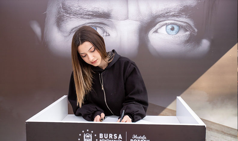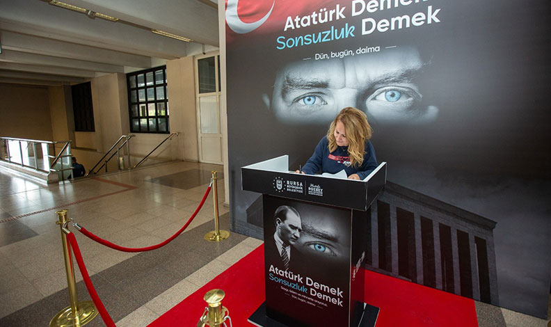 Mustafa Kemal Atatürk’ün aramızdan ayrılışının 87. yıl dönümünde Bursa’da kalpler ve kalemler, Büyükşehir Belediyesi’nin projesi ile bir araya geliyor. Bursalılar, Ata’ya duydukları özlem ve sevgilerini Büyükşehir Belediyesi’nin kentin farklı noktalarına kurduğu anı defteri stantlarıyla satırlara döküyor.