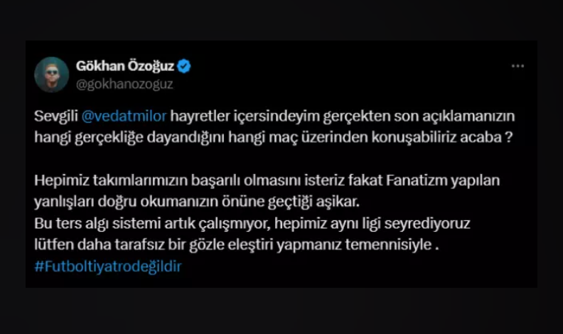 Gerçekten son açıklamanızın hangi gerçekliğe dayandığını hangi maç üzerinden konuşabiliriz acaba? Hepimiz takımlarımızın başarılı olmasını isteriz fakat fanatizm, yapılan yanlışları doğru okumanızın önüne geçtiği aşikar. Bu ters algı sistemi artık çalışmıyor, hepimiz aynı ligi seyrediyoruz. Lütfen daha tarafsız bir gözle eleştiri yapmanız temennisiyle” ifadelerini kullandı.