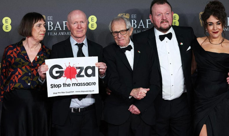 Suriyeli mültecileri konu alan “The Old Oak” filmi ile 2024 BAFTA’da yarışan Loach, İngiltere’nin başkenti Londra’daki Royal Albert Hall’da yapılan ödül töreni sırasında kırmızı halıda, filmin yazarı Paul Laverty tarafından tutulan ” Gazze : Katliamı Durdurun” yazılı pankartın yanında poz verdi. BAFTA ödüllü film yapımcısı Rebecca O’Brien da söz konusu pankart ile poz verenlerden biri oldu.