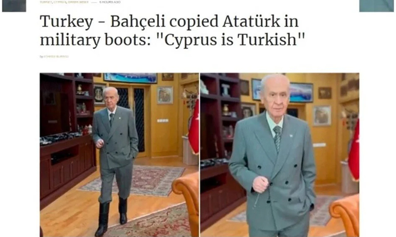 Milliyetçi Hareket Partisi (MHP) lideri Devlet Bahçeli, Kuzey Kıbrıs’ta yaşanan BM gerginliği konusunda, makamında Söke Körüklü Çizmesi giyerek dolaştığı bir video paylaşarak “Kıbrıs Türktür” mesajı verdi. Bahçeli’nin paylaşımı Yunan basınında büyük ilgi çekti.