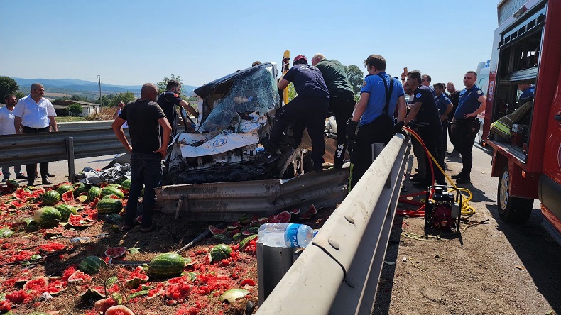Balıkesir-Bursa otobanında karpuz yüklü kamyonet refüje çarptı. Yola dökülen karpuzlar tehlike saçarken, sürücü ön kısmı parçalanan kamyonet içerisinde sıkıştı.