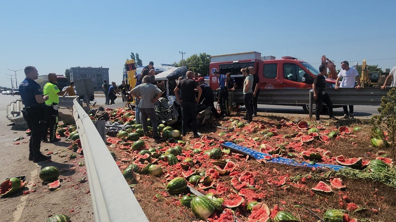 Ortalığı savaş alanına çeviren kazada yola saçılan karpuzlar görevliler tarafından temizlenirken, sürücünün kamyonetten çıkarıldığı anlar kameraya yansıdı.