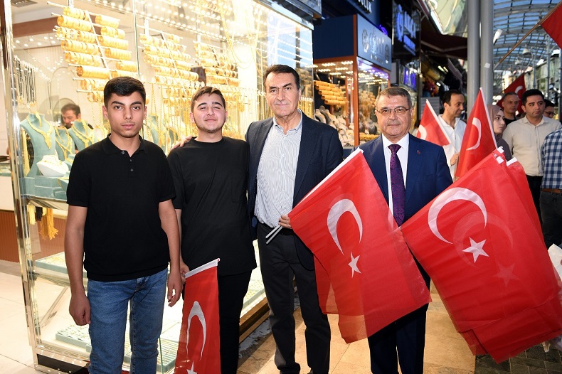 Başkan Dündar, Cumhuriyetin kuruluşunun 100. yıl dönümünü çarşı esnafıyla birlikte kutladı. Tarihi Çarşı ve Hanlar Bölgesi’nde esnafı ziyaret eden Dündar, dükkan camlarına asmaları için Türk Bayrağı hediye etti. Alışveriş yapan vatandaşlarla da sohbet eden Başkan Dündar, tüm Bursalıların 29 Ekim Cumhuriyet Bayramı’nı kutladı.