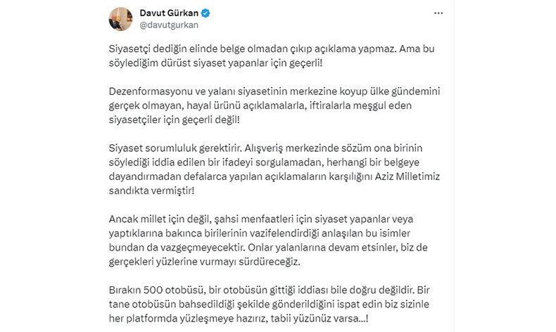 Onlar yalanlarına devam etsinler, biz de gerçekleri yüzlerine vurmayı sürdüreceğiz. Bırakın 500 otobüsü, bir otobüsün gittiği iddiası bile doğru değildir. Bir tane otobüsün bahsedildiği şekilde gönderildiğini ispat edin biz sizinle her platformda yüzleşmeye hazırız, tabii yüzünüz varsa” dedi.