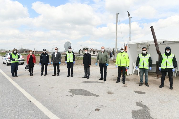 Kontrol noktasındaki uygulamaları yakından takip eden Mustafakemalpaşa İlçe Emniyet Müdürü Mithat Öztaş Başkan Kanar ile beraberindeki Başkan Yardımcıları Fatma Kocaman ve Ercan Leblebiciyi karşılayarak tebrikleri kabul etti. Korona virüs önlemleri kapsamında il sınırına yakın bölgede görev yapan polisleri unutmayan Başkan Kanar, seyahat eden sürücülere de kolonya hediye etti.