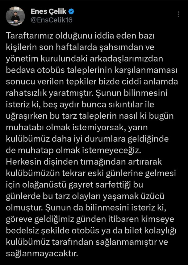 Taraftarımız olduğunu iddia eden bazı kişilerin son haftalarda şahsımdan ve yönetim kurulundaki arkadaşlarımızdan bedava otobüs taleplerinin karşılanmaması sonucu verilen tepkiler bizde ciddi anlamda rahatsızlık yaratmıştır. Şunun bilinmesini isteriz ki, beş aydır bunca sıkıntılar ile uğraşırken bu tarz taleplerin nasıl ki bugün muhatabı olmak istemiyorsak, yarın kulübümüz daha iyi durumlara geldiğinde de muhatap olmak istemeyeceğiz. Herkesin dişinden tırnağından artırarak kulübümüzün tekrar eski günlerine gelmesi için olağanüstü gayret sarfettiği bu günlerde bu tarz olayları yaşamak üzücü olmuştur. Şunun da bilinmesini isteriz ki, göreve geldiğimiz günden itibaren kimseye bedelsiz şekilde otobüs ya da bilet kolaylığı kulübümüz tarafından sağlanmamıştır ve sağlanmayacaktır.