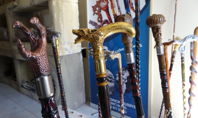 Yozgat’ın Aydıncık ilçesinde yaşayan Erol Gürgen, memleketlerin kültürel ve tarihi simgelerini tasarladığı baston ve asa başlıklarına işliyor.