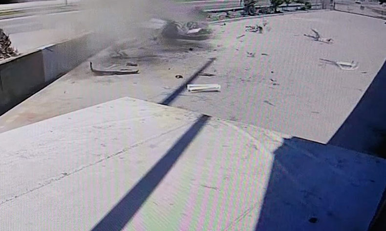 Kaza anı bir iş yerinin güvenlik kamerasına saniye saniye yansıdı. Görüntülerde aracın duvara çarpıp fabrika bahçesine uçtuğu, yaralıların araçtan fırladığı, araçta da yangın çıktığı görüldü.