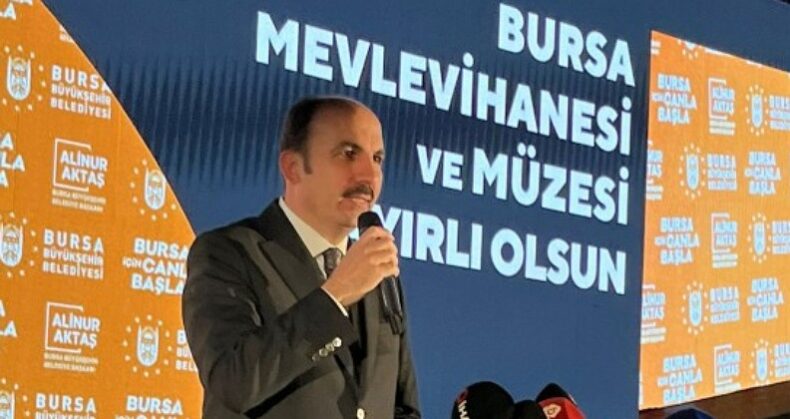 Böyle bir anlamlı gecede birlikte olmaktan gurur duyuyorum. Benden önce konuşan çok değerli konuşmacılarımız ifade ettiler. Mühim olan bir kültür oluşturabilmek. Onun için iklimi oluştururken mekanların çok büyük önemi var. Bir Mevlevihane’yi tekrar canlandırıyoruz. Bunun gibi 21 yıldır yaptığımız hizmetlerle gerçekten her anlamda kültürü sanatıyla kalkınmasıyla farklı bir Türkiye’yi oluşturabilmek. Bursa’ya da önemli bir hizmeti kazandırmış oluyoruz. Bu işte emeği geçen herkesi kutluyorum.