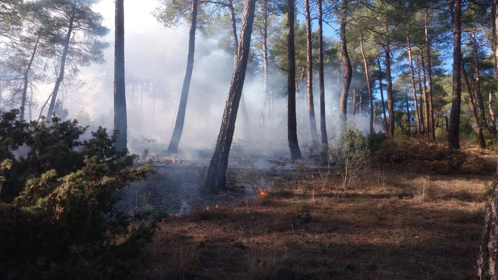 Kırsal Akçabük Mahallesi ile Yürücekler Mahallesi arasındaki kızılçam ormanında, henüz bilinmeyen nedenden yangın çıktı.
