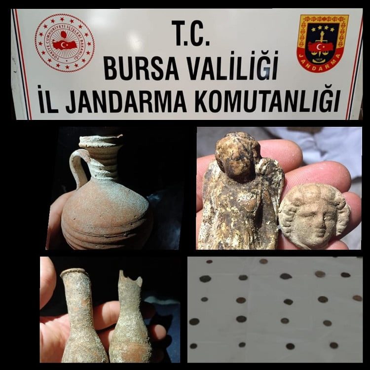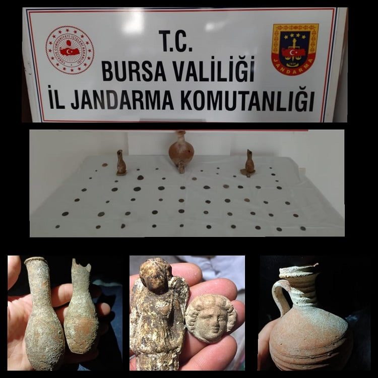Bursa İl Jandarma ve Gürsu İlçe Jandarma Komutanlığı ekipleri, yol kontrolünde şüphelendikleri aracı durdu. İçerisinde 2 kişinin olduğu 16 ACT 374 plakalı otomobilde yapılan aramada, 11 adet tarihi eser niteliğindeki obje, 52 adet ise Roma ve Bizans dönemine ait sikke ele geçirildi.