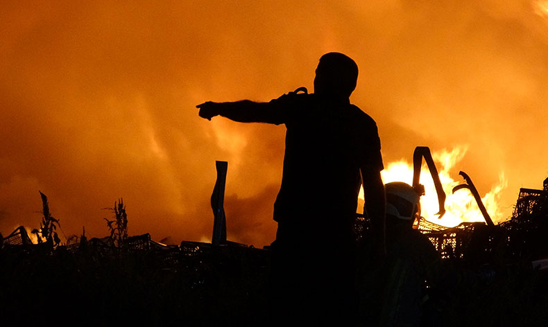 Soğuk hava deposunun açık bölümünde plastik sepetlerin olduğu alanda çıkan yangın kısa sürede büyüdü.