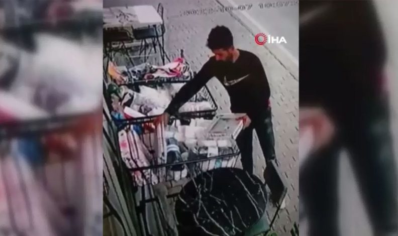 Cadde üzerinde yürüyen bir şahıs elini kolunu sallayarak kaldırım üzerinde reklam amaçlı duran nevresim takımını çalarak kayıplara karıştı. O anlar iş yerinin güvenlik kamerasına saniye saniye yansıdı.
