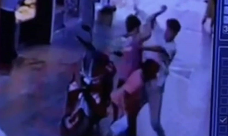 Kavga sırasında iş yerinin önünü süpüren bir esnaf, kavga eden gençleri elindeki süpürgeyle ayırdı. O anlar bir iş yerinin güvenlik kamerasına saniye saniye yansıdı.
