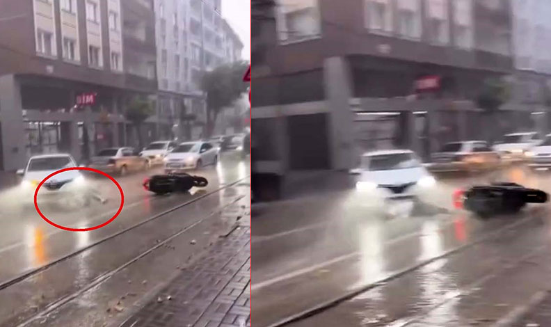 Kaza, merkez Yıldırım ilçesi Hocataşkın Mahallesi İncirli Caddesi’nde meydana geldi. Cuma günü aniden bastıran yağmur hayatı durma noktasına getirdi. Yağmurdan en çok etkilenenlerden biri de motokuryeler oldu. İncirli Caddesi’nde seyir halinde olan motokurye önüne aniden araç çıkması sebebiyle frene yüklenince yağmur nedeniyle kaydı. Motosikletten yere düşen sürücünün kafası aracın lastiğine çarptı. Araç sürücüsünün o sırada durması ve çevredekilerin bağırması motokuryenin ağır yaralanmasının önüne geçti. Kaza anı o sırada yağmurun şiddetini çeken bir vatandaşın cep telefonu kamerasına yansıdı.