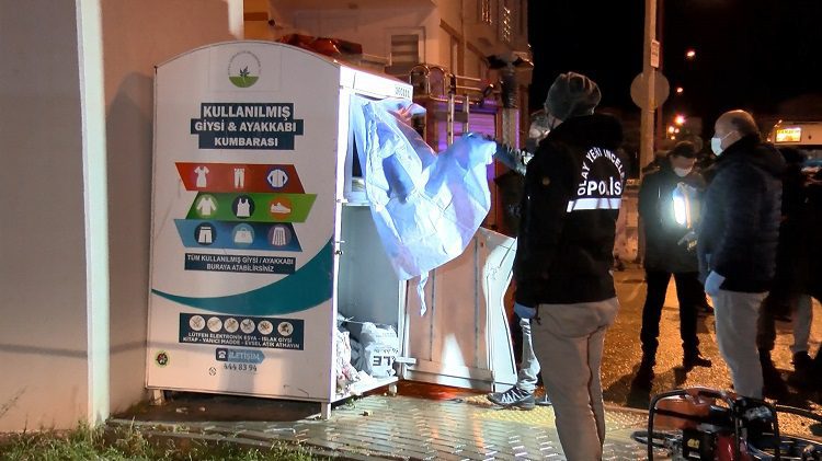 Sokaktan geçen vatandaşlar, baş kısmı giysi kumbarasının içerisinde bulunan bir kişiyi hareketsiz şekilde görünce durumu polise bildirdi. İhbar üzerine olay yerine çok sayıda polis, itfaiye ve sağlık ekibi sevk edildi.