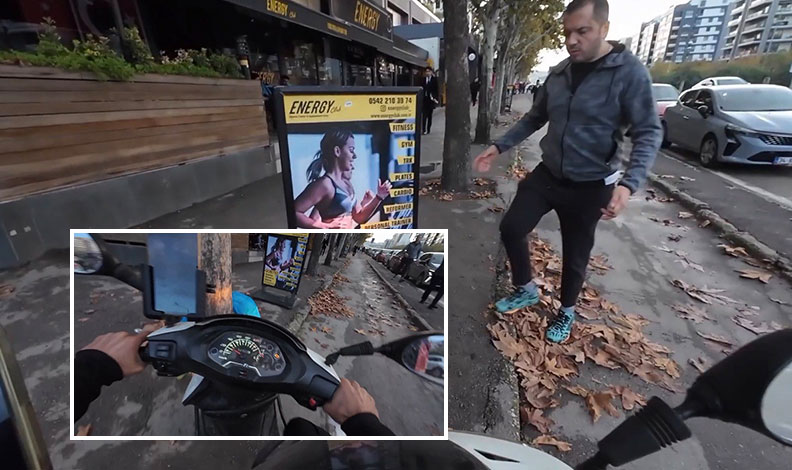 Kaza anını gören bir vatandaş ise sürücüye “İyice sıyırdınız, dikkat et. Yağışlı yerler, kendi canını hiçe sayıyorsun” diyerek hem uyarıda bulundu hem de çevredekileri güldürdü.
