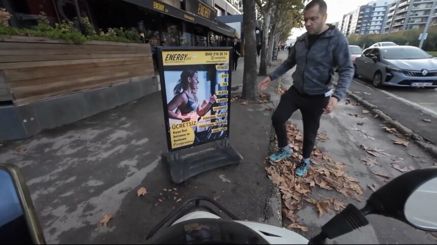 Bursa’da başka bir araç sürücüsüne sözlü olarak tepki gösteren motosikletli, gaza ani şekilde yüklenince kaygan zeminde kontrolü kaybedip kaldırım üzerindeki reklam dubasına çarptı. Olay sırasında çevrede bulunan bir vatandaşın yaptığı esprili uyarı dikkat çekti.