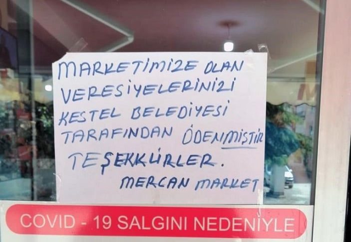 Bursa’nın Kestel ilçesinde tüm bakkal ve küçük marketlerin kapılarında bugünlerde benzer yazılar asılı. Nedeni ise “Biz Büyük Bir Aileyiz” sloganını harekete geçiren Kestel Belediye Başkanı Önder Tanır’ın ilçedeki tüm veresiye defterlerini tek tek toplaması.