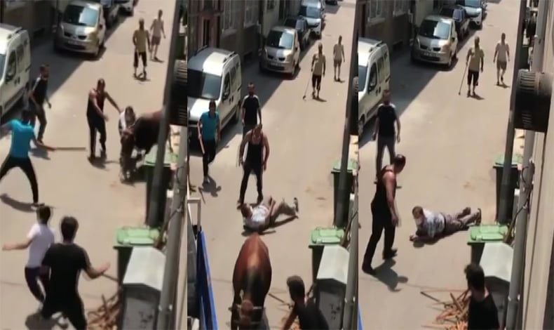 Bursa’da Kurban Bayramı öncesi sahibinin elinden kaçan bir boğa mahalle sakinlerine zor anlar yaşattı. Öfkeli boğa kendisini yakalamak isteyen bir mahalle sakinini yere serdi.