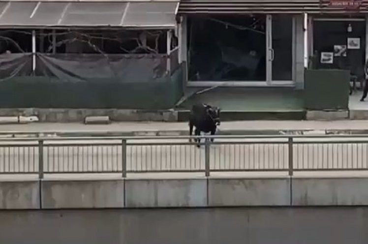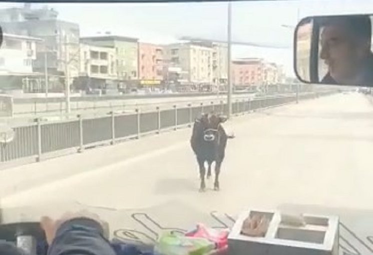 Araçlar tarafından kıstırılan boğa, bir vatandaşın sopa ile yere vurmasına sinirlendi. Bunun üzerine kızgın boğa, onlarca vatandaşı önüne katınca İspanyol arenasını aratmadı.