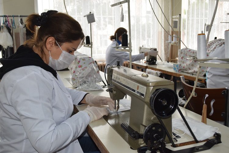 Koronavirüs önlemleri kapsamında tüm Türkiye’de olduğu gibi Bursa’da da mesleki ve teknik anadolu liselerinin üretim kapasitesi harekete geçirilerek temizlik ve dezenfeksiyon ürünlerinin yanı sıra maske ve yüz koruyucu siper için de seri üretime başlandı. Mustafakemalpaşa Nilüfer Hatun Mesleki Teknik Anadolu Lisesi öğretmenleri de okulda maske dikiyor.