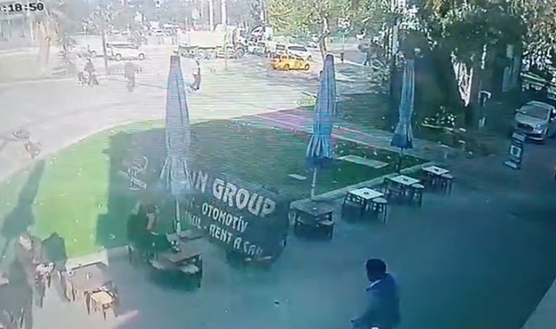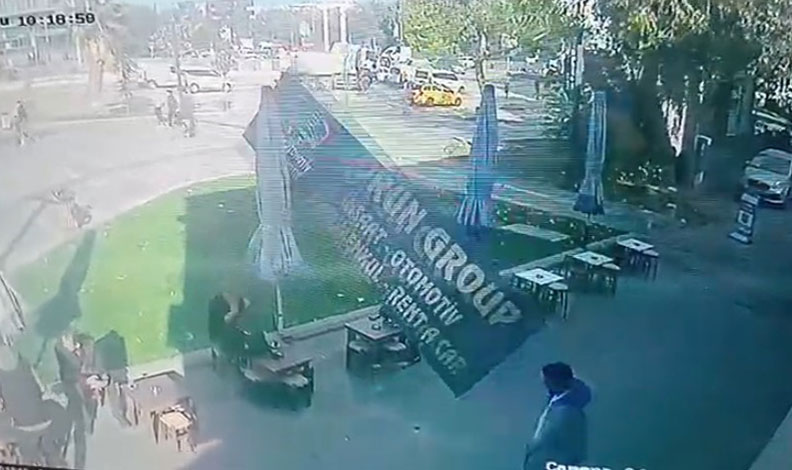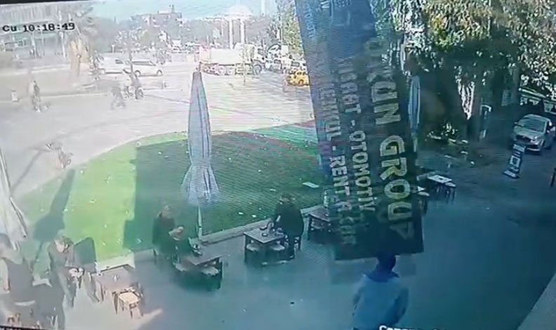 Osmangazi ilçesi Ulu Mahalle’de bulunan bir kafede çay içen iki kişi, lodosun etkisiyle yerinden koparak düşen tabelanın altında kalmaktan saniyelerle kurtuldu. O anlar, iş yerinin güvenlik kamerasına anbean yansıdı.