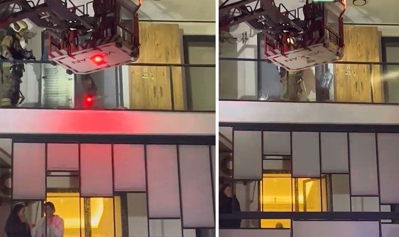 Küçük çaplı başlayan alevlere müdahale etmek için daireye balkondan girmek isteyen itfaiye ekiplerine, sinir krizi geçiren kadın müdahale etti. Eline damacanayı geçiren kadın, itfaiye ekiplerine fırlattı.