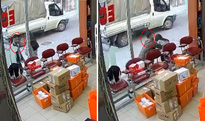 Eczanede çalışan D.Ö. (21), kısa bir süreliğine dışarı çıktı. Bu sırada yanına yaklaşan bir kişinin aniden üzerine atlamasıyla genç kadın yere düştü. Durumu fark eden iş arkadaşı hemen olaya müdahale ederken, korku dolu anlar kameraya yansıdı.