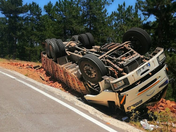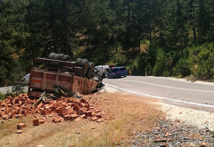 Bursa’nın Büyükorhan ilçesine bağlı Aktaş Mahallesi’nde bir kamyon ilçe merkezine tuğla nakliyesi yaptığı esnada rampa aşağı inerken sürücüsünün direksiyon hakimiyetini kaybetmesi sonucu devrildi.