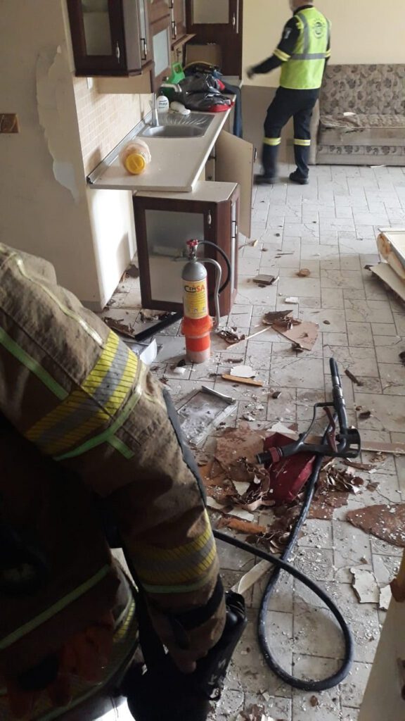 Patlamanın sesi ve şiddetiyle büyük korku yaşayan komşular ise polis, itfaiye, sağlık ve doğal gaz ekiplerine haber verdi.