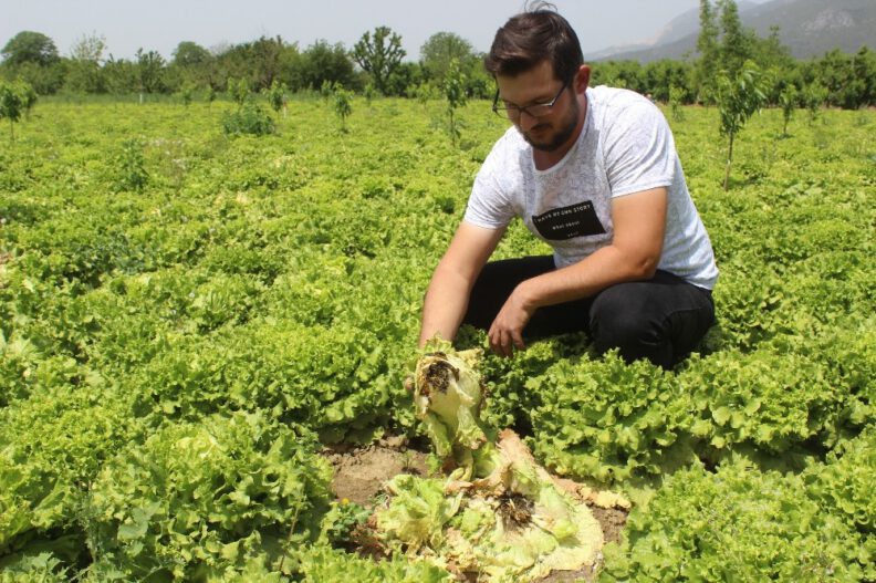 Ürünleri tarlada çürüyen İlyas Gümüş, “Ben bilgisayar mühendisiyim ama babamın mesleği olan çiftçiliği tercih ettim. Ektiğimiz marullar sokağa çıkma kısıtlamasında hasat edemediğimiz için tarlada kaldı. Marullar vatandaşa ulaşamadığı için ürünlerimiz çürüyor. Benim bir tarlamda 45 bin adet marul çürüdü. Biz çiftçiler olarak yetkililerden ekmek dağıtıcıları gibi sokağa çıkma kısıtlamasında izin istiyoruz. Ürünlerimizi vatandaşın ayağına götürelim tarlada çürümesin. Ürünler tarlada çürüyünce fiyatların artmasına sebep oluyor” dedi.