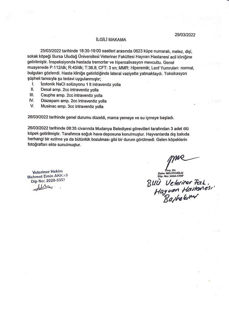 “Bu olayın Mudanya’da gerçekleşmiş olması hepimizi çok üzdü. Olayın gerçek yüzünü anlamadan, gerçek dışı iddialar üzerinden belediyemizi ve şahsımı akıl almaz iftiralarla bir cana kıymakla suçlayan kim varsa hakkında yasal süreci başlattık. Açacağımız maddi ve manevi tazminat davalarından elde edilecek tazminatları da sokak hayvanları için harcayacağız. Veteriner Hizmetleri Bürosu ekiplerimiz haber geldiği anda olay yerine gitmiş ve zehirlenerek hayatını kaybeden 4 canımızı belediyeye ait araçla almışlardır. Hayatını kaybeden köpekler, sabah saatlerinde Uludağ Üniversitesi Veterinerlik Fakültesi’ne teslim edilmiştir. Bunun yanı sıra zehirlenerek ölen köpeklerin belediyemiz çöp araçlarında preslendiği iddia edilmiştir. Uludağ Üniversitesi Veterinerlik Fakültesi’nde zehirlenen 4 köpeğin otopsi sonucu da bu iddianın da yalan olduğunu ortaya çıkarmıştır. Olayla ilgili adli soruşturma sürmektedir. Konuyla ilgili Veteriner Hizmetleri Büromuzda görevli personelimiz, kolluk kuvvetlerinin olayı aydınlatabilmesi için ifadelerini vermişlerdir. Tek bir canımızın daha zarar görmemesi için ilgili tüm ekiplerimiz teyakkuzdadır. Dilerim ki ülkemin hiçbir yerinde bu tarz vakalar bir daha yaşanmasın” diye konuştu.