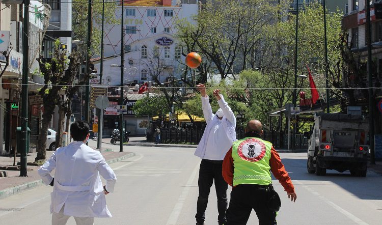 Sokağa çıkma  yasağı kapsamı dışında olan eczacılar şehir merkezinde müşteri gelmediği için zamanlarını caddede voleybol oynayarak geçirdiler.