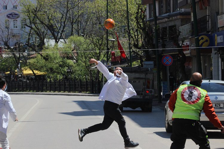 Bursa’da sokağa çıkma kısıtlamasında dükkanlarını açan eczacılar, müşteri olmadığı için canları sıkılınca, şehrin en kalabalık caddesine ip gerip voleybol oynadı.