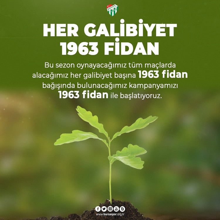 Bursaspor Kulübü, yeni sezonda alacakları her galibiyette 1963 adet fidan bağışında bulunacaklarını açıkladı.