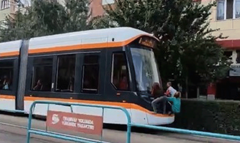 Seyir halindeki tramvayın arkasına tutunarak hiçbir güvenlik tedbiri olmadan yolculuk yapan çocuklar, gören vatandaşların da tepkisine neden oldu. Düz yolda süratle ilerleyen tramvayın arkasında yolculuk yaparak canlarını hiçe sayan çocuklar, bir vatandaş tarafından cep telefonu kamerası ile görüntülendi.