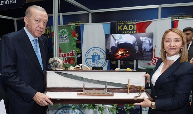 Pazaryeri Belediye Başkanı Zekiye Tekin, Yerel Yönetimlerde Kadın Zirvesi’nde Cumhurbaşkanı Recep Tayyip Erdoğan’a kılıç hediye ederek, “Kılıcın keskin olsun reisim” dedi.