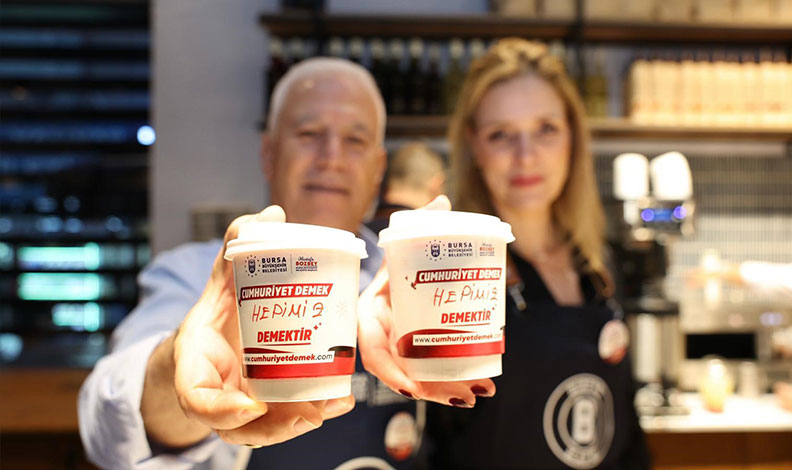 Eşi Seden Bozbey ile birlikte barista önlüklerini giyen Başkan Bozbey, Cumhuriyetin 102. yılına özel olarak hazırlanan ‘Cumhuriyet Demek’ temalı bardaklarda içecek ikramında bulundu. Vatandaşların isimlerini ‘Cumhuriyet demek’ temalı bardaklara yazan Başkan Mustafa Bozbey ve eşi Seden Bozbey, Atatürk’ün emanet ettiği Cumhuriyet’in sıcaklığını Bursalılarla birlikte paylaştı. Bu sene kutlamaların teması olan ‘Cumhuriyet demek, hepimiz demek’ sloganını da yazarak ikramda bulunan Başkan Bozbey ve eşi Seden Bozbey, kahve keyfini vatandaşlarla birlikte yaşadı.
