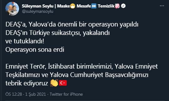 Bakan Soylu, Twitter hesabından yaptığı açıklamada, DEAŞ’a yönelik Yalova’da önemli bir operasyon yapıldığını belirterek, “DEAŞ’ın Türkiye suikastçısı, yakalandı ve tutuklandı! Operasyon sona erdi. Emniyet terör, istihbarat birimlerimizi, Yalova Emniyet Teşkilatımızı ve Yalova Cumhuriyet Başsavcılığımızı tebrik ediyoruz” ifadelerini kullandı.