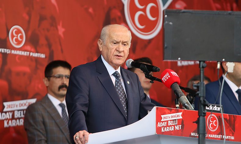 MHP Genel Başkanı Bahçeli, Mersin Millet Bahçesi yanındaki miting alanında, partisince düzenlenen ‘2023’e Doğru: Aday Belli, Karar Net’ mitinginde vatandaşlara seslendi. Mersinlilerden 2023 yılı seçimlerinde Cumhur İttifakı’nın adayı Cumhurbaşkanı Recep Tayyip Erdoğan’a destek vermelerini isteyen Bahçeli, “Türkiye’de muhalefet kıtlığı ve kısırlığı maalesef ileri düzeydedir. Bu yüzden Türk siyaseti yaprak dökmektedir. Bu sebeple Türk siyaseti kurumuş toprak gibidir. Demokrasi standartları bizzat muhalefet partileri eliyle düşürülmektedir. Demagoji, demokrasiyi örselemekte ve öğütmektedir. Çünkü muhalefet partileri zillettedir, köksüz ve kimliksizdir. Siyasi ikballerini, ülke çıkarlarının üzerinde gören bir siyasi zihniyetin inandırıcılığı olamaz, itibarı olamaz, ilkesi olamaz, ikna edici hiçbir yanı da olamayacaktır” diye konuştu.