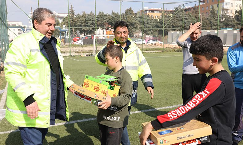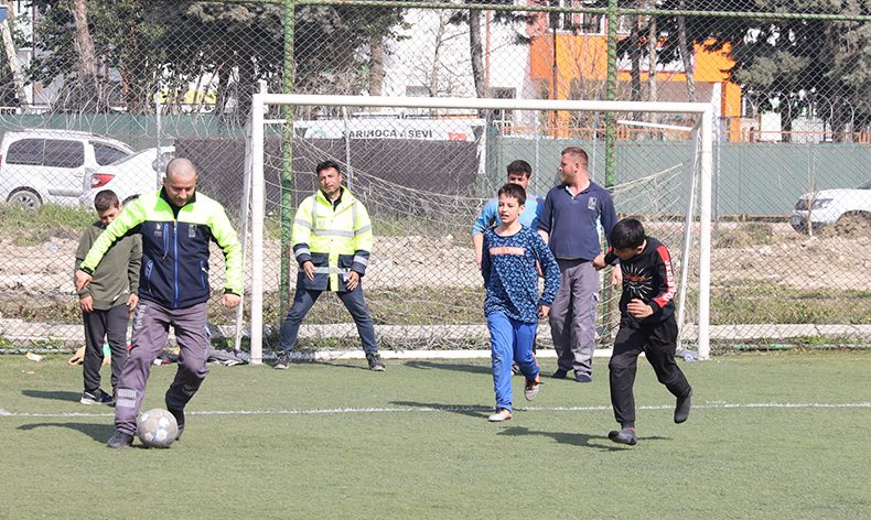 Hatay’da yaraların sarılması için yoğun mesai harcayan Bursa Büyükşehir Belediyesi BUSKİ ekipleri, hem alt yapıyı hem de moralleri onarıyor. Akranları başka şehirlere gittiği için yalnız kalan 3 arkadaş, BUSKİ personeline maç teklif etti. Öğle paydosunda gerçekleştirilen mücadele ile keyifli anlar yaşayan çocuklar, maçın ardından çeşitli hediyelerle ödüllendirildi.