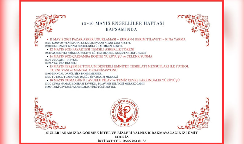 10-16 Mayıs Engelliler Haftası kapsamında, Kestel’de farkındalık yaratmak amacıyla özel etkinlikler düzenleniyor. Özel Darülşifa Bakım Merkezi koordinasyonunda gerçekleştirilen haftalık programda asker uğurlamasından futbol turnuvasına, şiirli söyleşilerden çevre farkındalık yürüyüşüne kadar pek çok anlamlı etkinlik yer alıyor.