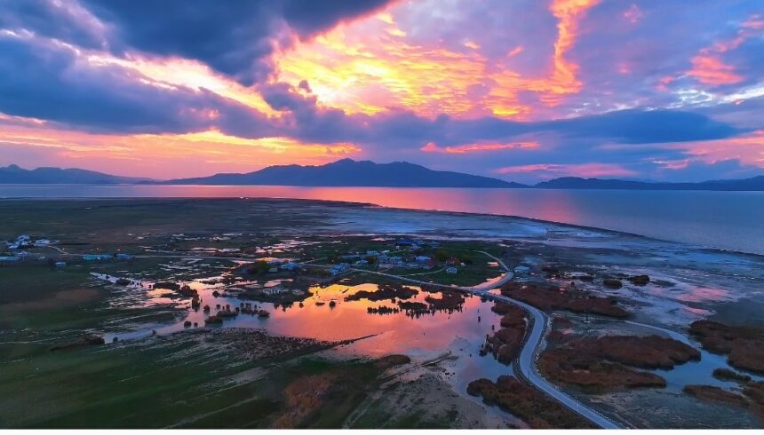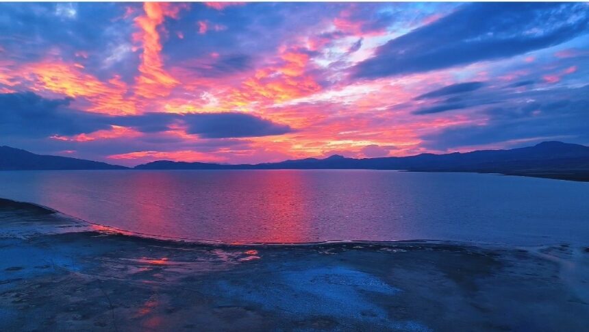 Van’ın doğusunda yer alan Erçek Gölü, gün batımında bir kez daha büyüleyici görüntülere sahne oldu. Doğa fotoğrafçısı Recep Dağ tarafından dronla kaydedilen görüntülerde, güneşin turuncu ve kızıl tonları gölün sakin sularına yansırken ortaya kartpostallık manzaralar çıktı. Günün son ışıklarıyla birlikte göl yüzeyinde oluşan renk cümbüşü, izleyenleri adeta mest etti. Gökyüzünün yavaş yavaş kararmaya başlamasıyla birlikte kuşların siluetleri de görüntülere ayrı bir güzellik kattı.