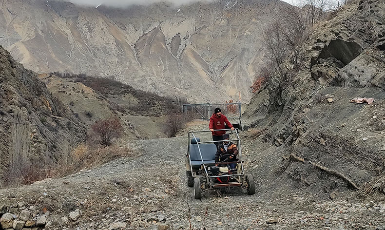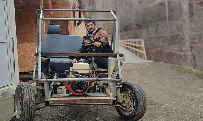Pandemi döneminde ortaya koyduğu girişimi, ailesinin ve kendi yaşamını kolaylaştıran pratik bir çözüm sunuyor. Mehmet Algün, çok az maliyetle yaptığı aracıyla mahalledeki tüm sokaklara rahatlıkla girebiliyor ve zorlu arazi şartlarda yük taşıma sorununu çözmüş durumda. Eski bir araba şasesini kullanarak kısaltma ve çeşitli eklemelerle özgün aracını ortaya çıkaran Algün, internetten bulduğu küçük bir motoru kullanarak aracını güçlendirdi.
