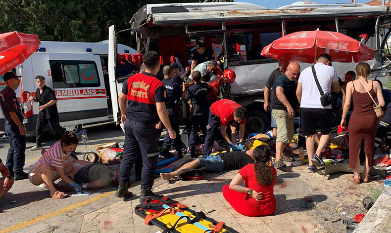 Muğla’nın Ula ilçesinde, iddiaya göre, freni boşalan bir tur otobüsü çevrede bulunan iş yeri ve eve çarparak durabildi. Can pazarının yaşandığı kazada 4’ü ağır çok sayıda kişi yaralandı. Sağlık ve itfaiye ekipleri bölgede çalışmalarını sürdürürken, yaralılar çevredeki hastanelere sevk ediliyor.
